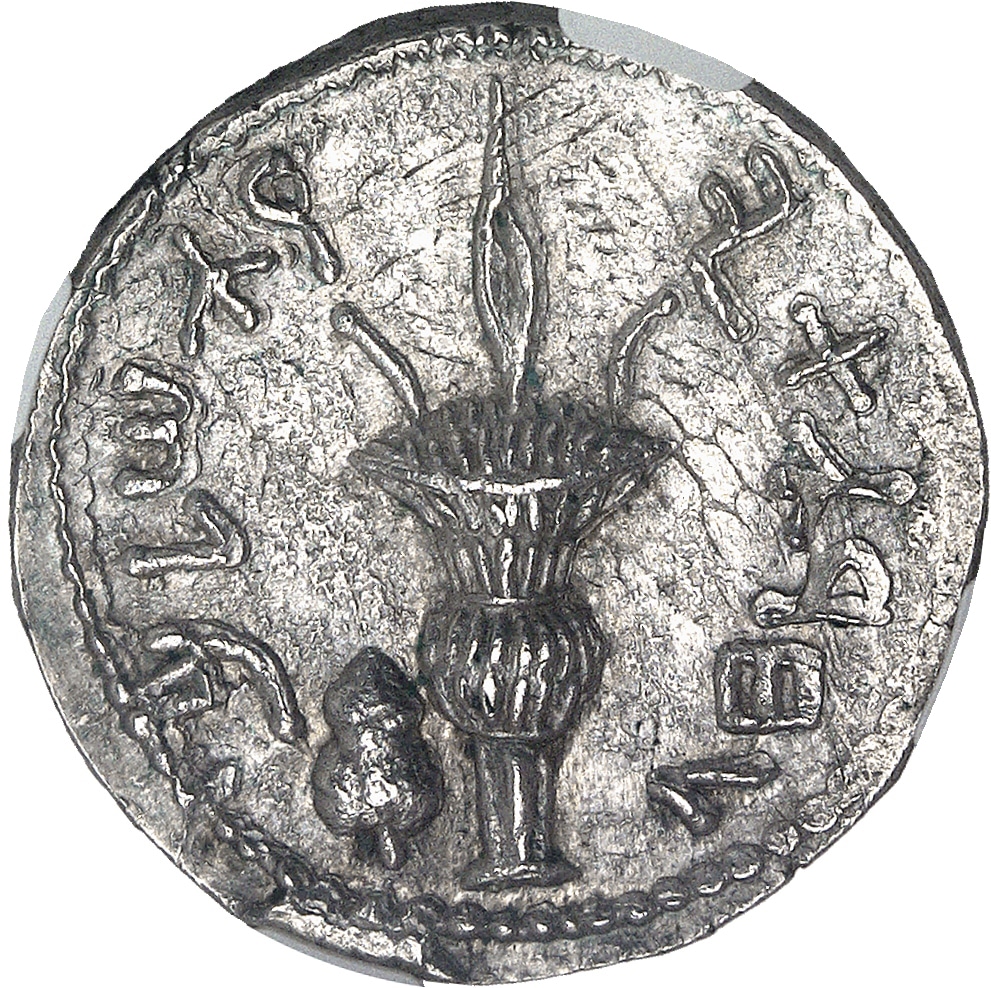 Rv. Légende hébraïque “Pour la liberté d’Israël”. Le loulav (feuille de palmier-dattier) avec à sa gauche un etrog (cédrat).