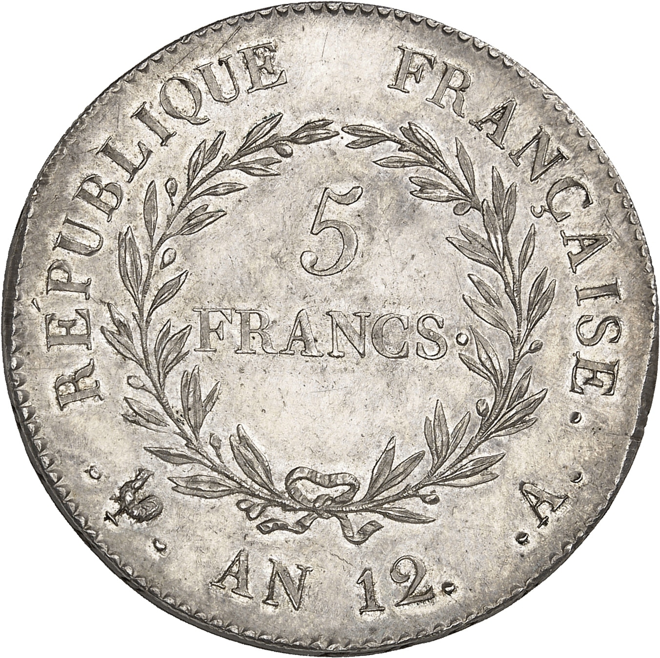 - Consulat (1799-1804). 5 francs Bonaparte An 12 (1804), A, Paris.
