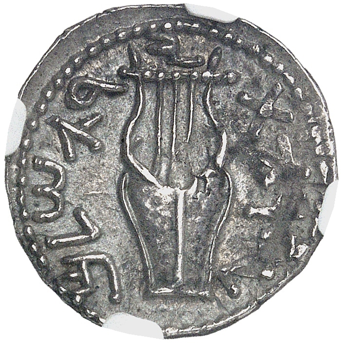 Rv. Légende hébraïque “Pour la liberté d’Israël”. Lyre à trois cordes, le tout dans un grènetis.
