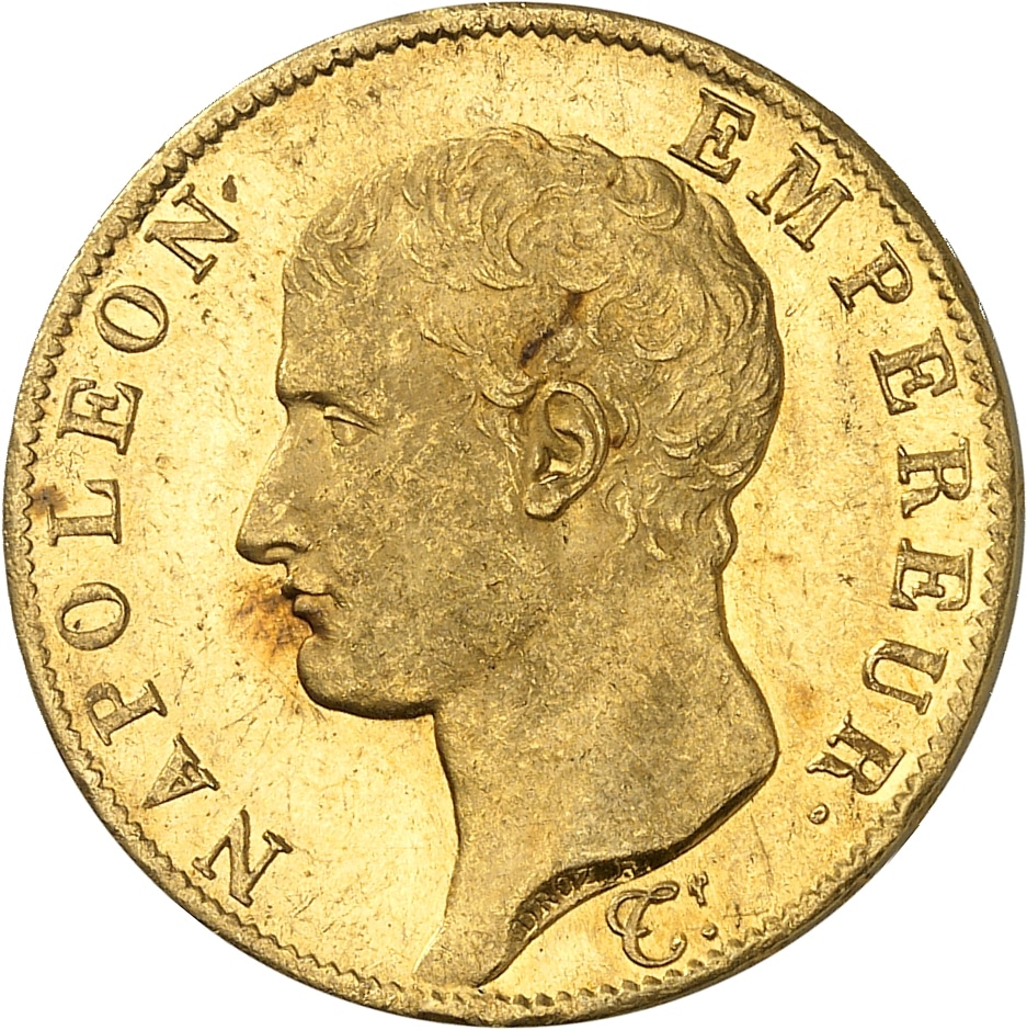 - Premier Empire / Napoléon Ier (1804-1814). 40 francs tête nue, calendrier révolutionnaire An 14 (1806), A, Paris.