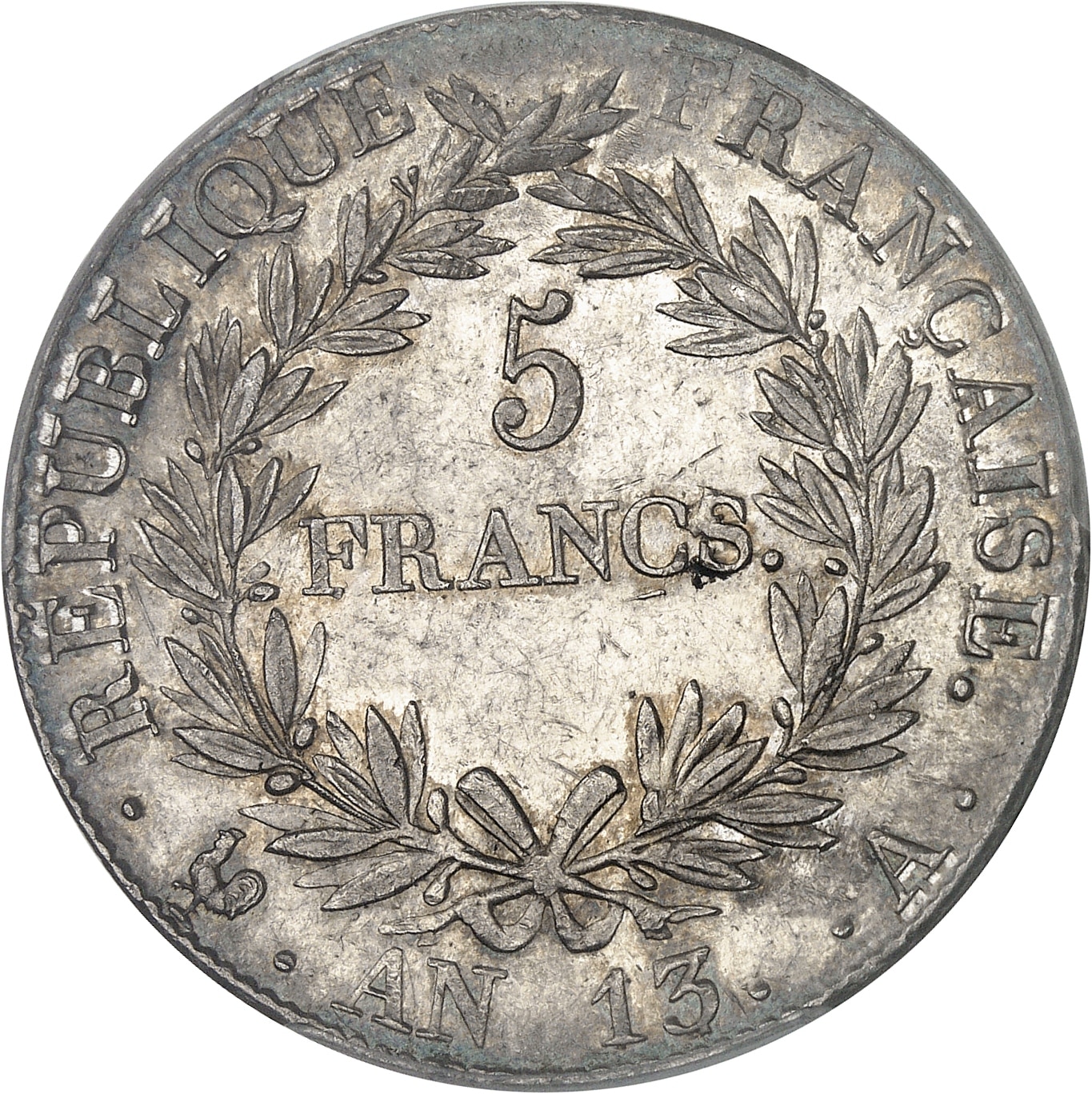 - Premier Empire / Napoléon Ier (1804-1814). 5 francs tête nue, calendrier révolutionnaire An 13 (1805), A, Paris.