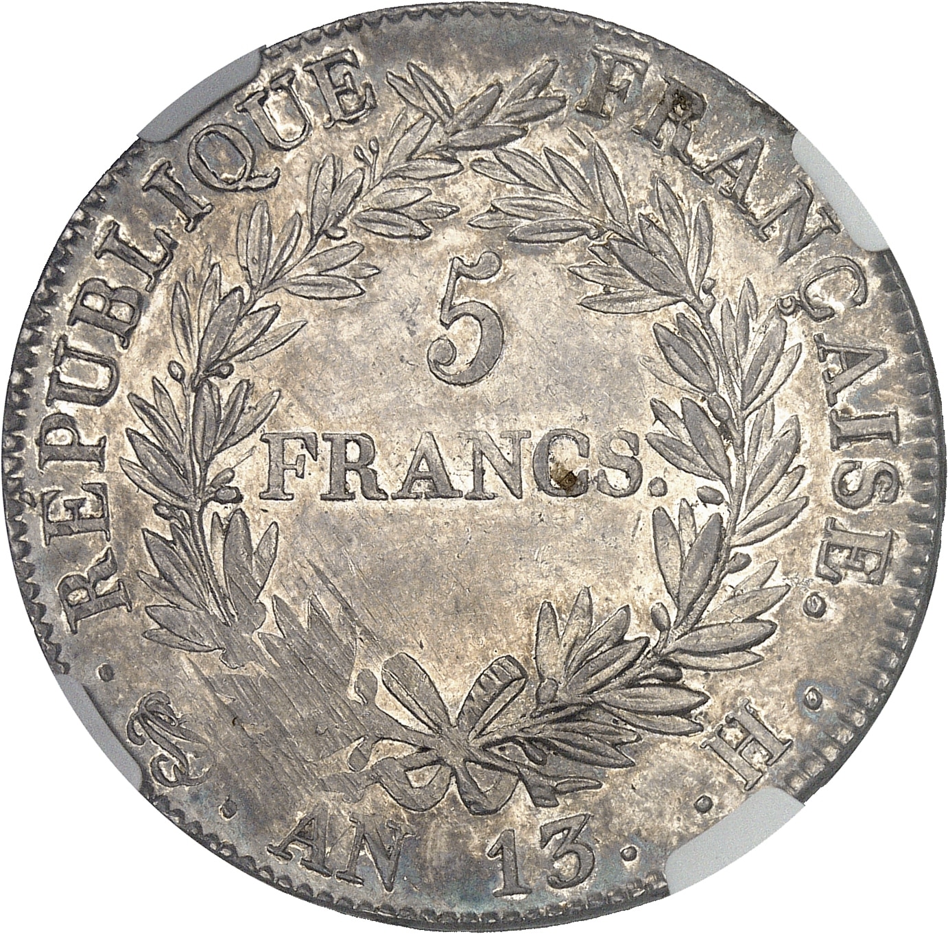 - Premier Empire / Napoléon Ier (1804-1814). 5 francs tête nue, calendrier révolutionnaire An 13 (1805), H, La Rochelle.