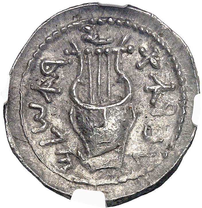 Rv. Légende hébraïque “Pour la liberté d’Israël”. Lyre ou cithare à trois cordes, le tout dans un grènetis.