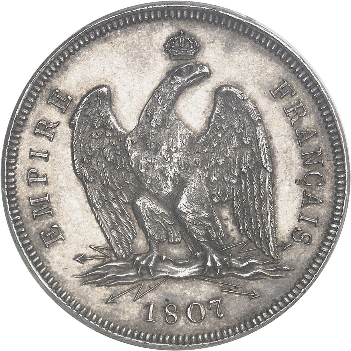 - Premier Empire / Napoléon Ier (1804-1814). Essai au module de 100 francs Or, en argent, par Vassallo, de poids lourd (piéfort ?), Frappe spéciale (SP) 1807, Gênes.