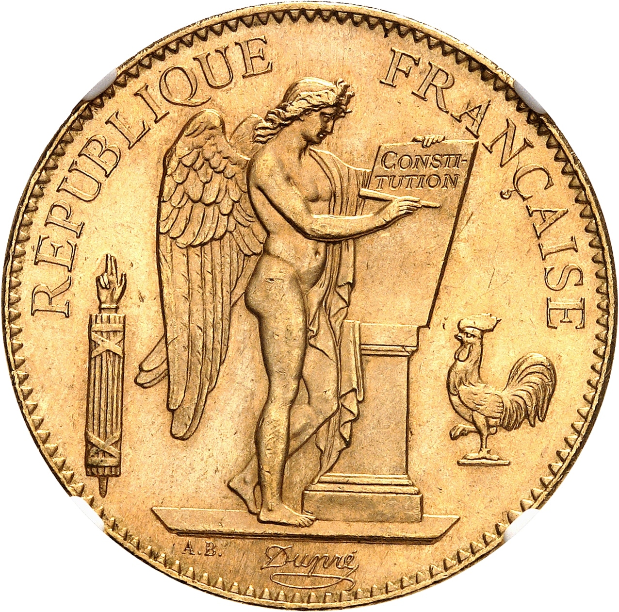 Av. RÉPUBLIQUE FRANÇAISE. Génie ailé de la République debout à droite, gravant le mot CONSTITUTION sur une table, accosté d’un faisceau à gauche et d’un coq à droite ; à l’exergue : signature A.B. et Dupré.