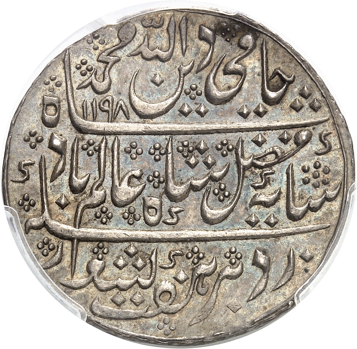 Indes françaises, Shah Alam II (1759-1806). Roupie 1198/32 (1784), Pondichéry.