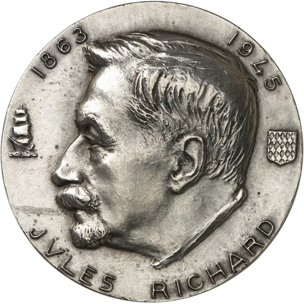 Rv. JVLES RICHARD 1863 - 1945. Buste de Jules Richard à gauche entre un voilier et l’écu de Monaco.