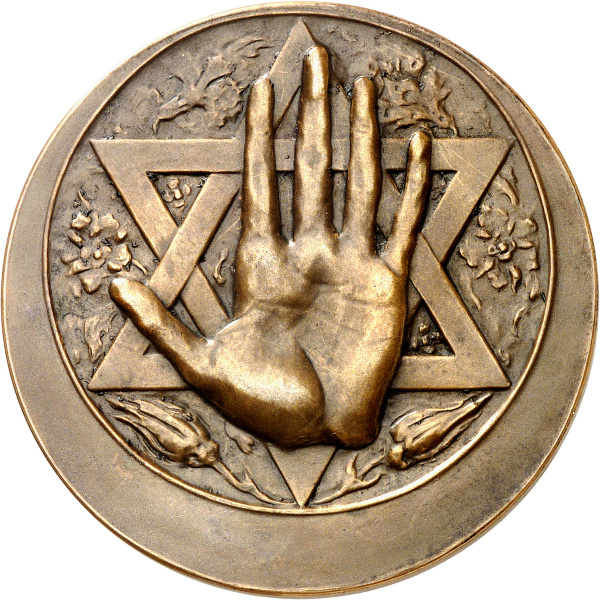 Rv. Dans un champ rond, déporté vers le haut, une main de face surplombe une étoile chérifienne dans un décor floral.
