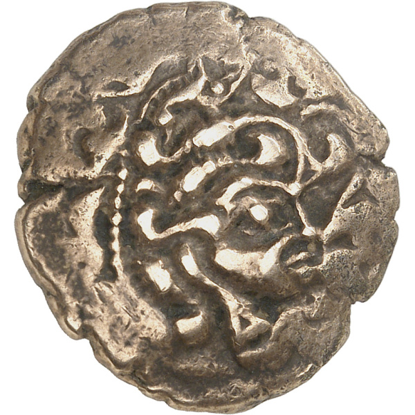 Av. Profil à droite, d’origine apollinienne, stylisé, surmonté d’une coiffure élaborée caractérisée par deux rouleaux horizontaux encadrés par des mèches en S. Sanglier en cimier.