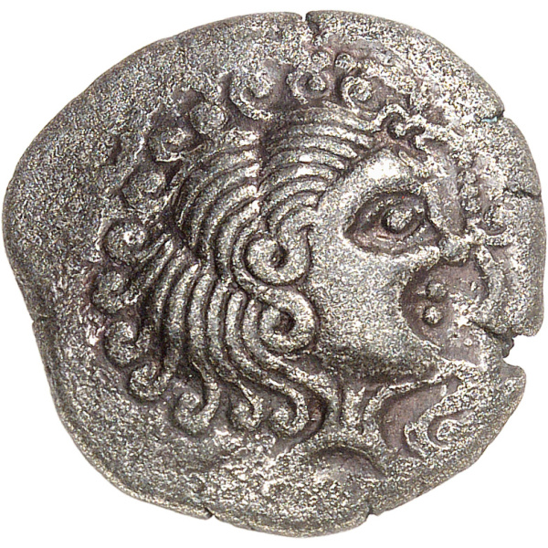 Rv. Cheval androcéphale à gauche, surmonté d'un aurige. Au-dessous, une roue à huit rais, dans une large volute.