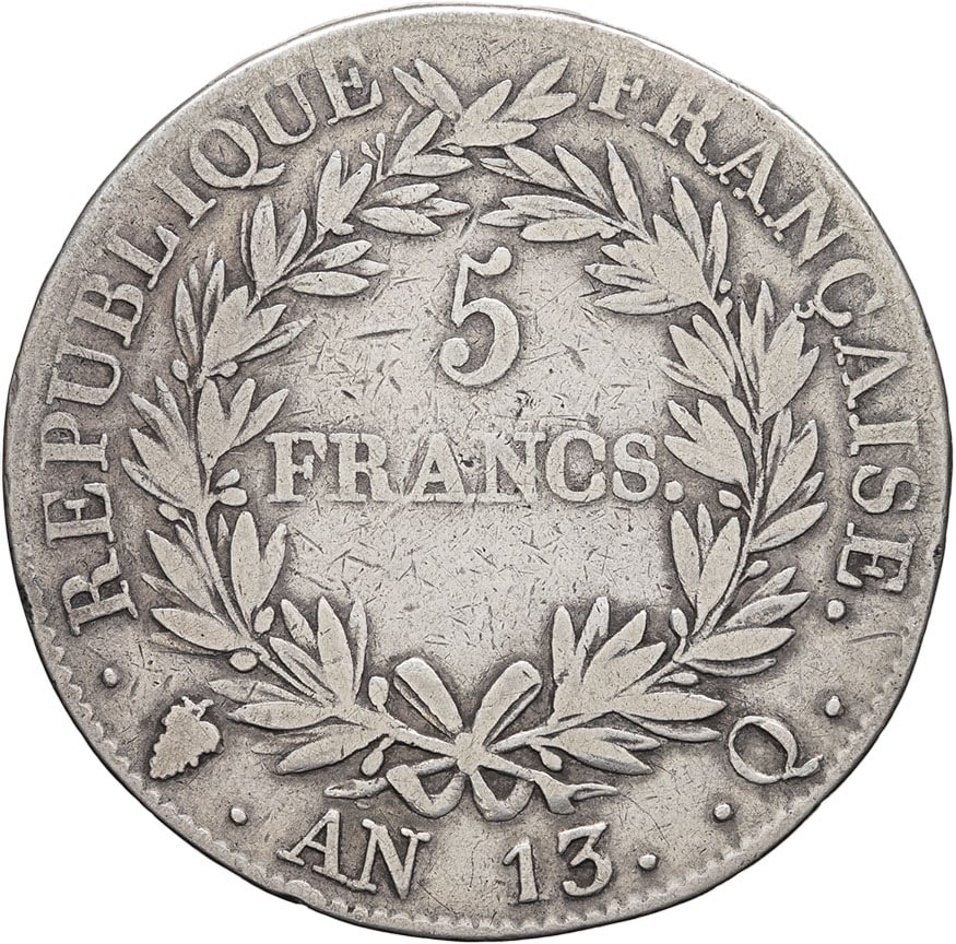 - Premier Empire / Napoléon Ier (1804-1814). 5 francs tête nue, calendrier révolutionnaire An 13 (1805), Q, Perpignan.