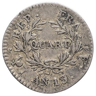 - Premier Empire / Napoléon Ier (1804-1814). Quart de franc calendrier révolutionnaire An 13 (1805), A, Paris.