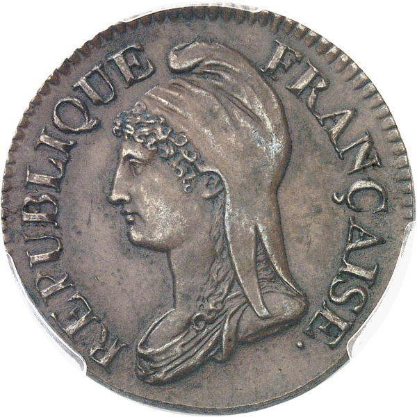Av. REPUBLIQUE FRANÇAISE. Buste de République à gauche, coiffée d’un bonnet de la liberté ; au-dessous signature cursive Dupré.