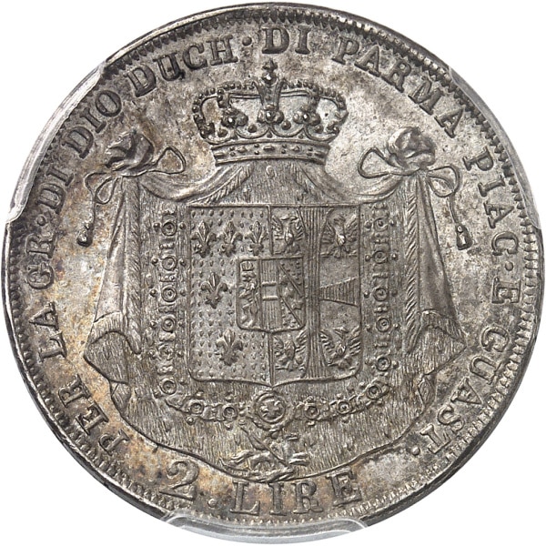 Rv. PER LA GR. DI DIO DUCH. DI PARMA PIAC. E GUAST. Armes entourées du collier et posées sur un manteau couronné, au-dessous 2 LIRE.