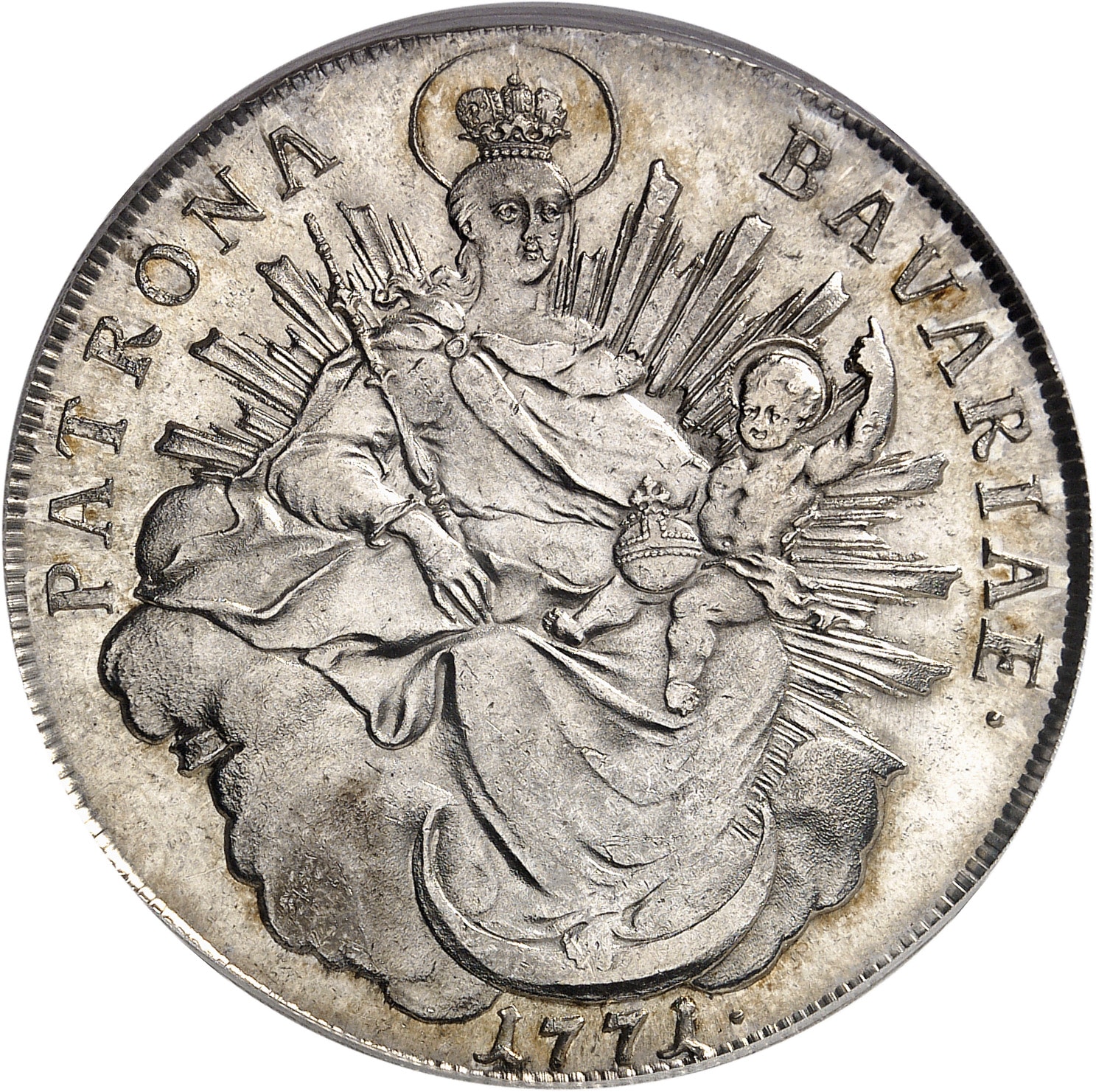 Rv. PATRONA BAVARIAE. La Vierge couronnée, avec sceptre, tenant l’enfant avec un globe crucigère, dans les nuées rayonnantes ; au-dessous (date).