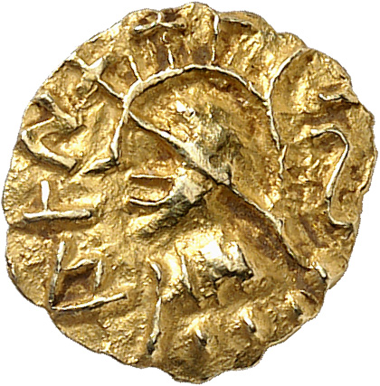 La légende est rétrograde au revers et de lecture TRADVLFVS. On rencontre TRASVLFVS en Moselle (57) à Mediano Vico (Moyenvic) qui ne semble pas le même personnage. Notre exemplaire n’est pas non plus pour cet atelier bien que le nom du monétaire soit identique. On note également que le type à la croix ancré n’y est pas répertorié. Le droit montre une S derrière le buste très stylisé, qui semble casqué bien qu’il s’agisse du diadème, et les lettres A, t ou L et N devant le visage. Une attribution à une localité du nom de SALN (par exemple, avec Salona attesté en 777 sur un diplôme de Charlemagne, aujourd’hui Salonnes (57) et dont on connaît un prieuré fondé par Fulrad au VIIe siècle) ne semble pas du tout certaine et une autre lecture du droit, qui pourrait aussi être ALN..IS, ne nous donne pas plus de solution d’attribution [Remerciements à Arent Pol pour ses informations]