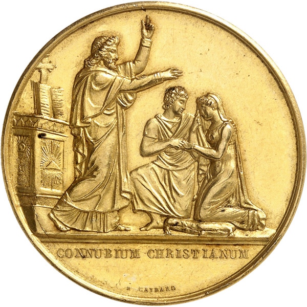 Av. CONNUBIUM CHRISTIANUM. Devant un autel, un prêtre debout à droite bénit un couple agenouillé et vêtu à l’antique ; signature R. GAYRARD.