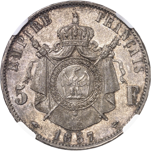 Second Empire / Napoléon III (1852-1870). 5 francs tête nue 1857, A, Paris.