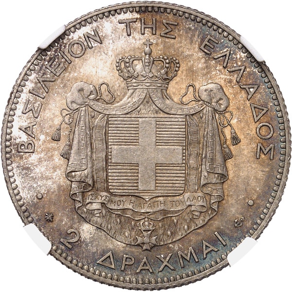 Rv. Légende en grec et 2 DRACHMES. Écu posé sur un manteau couronné.