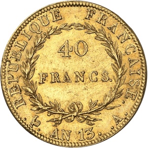 FRANCE Premier Empire / Napoléon Ier (1804-1814). 40 francs tête nue, calendrier révolutionnaire An 13 (1805),…