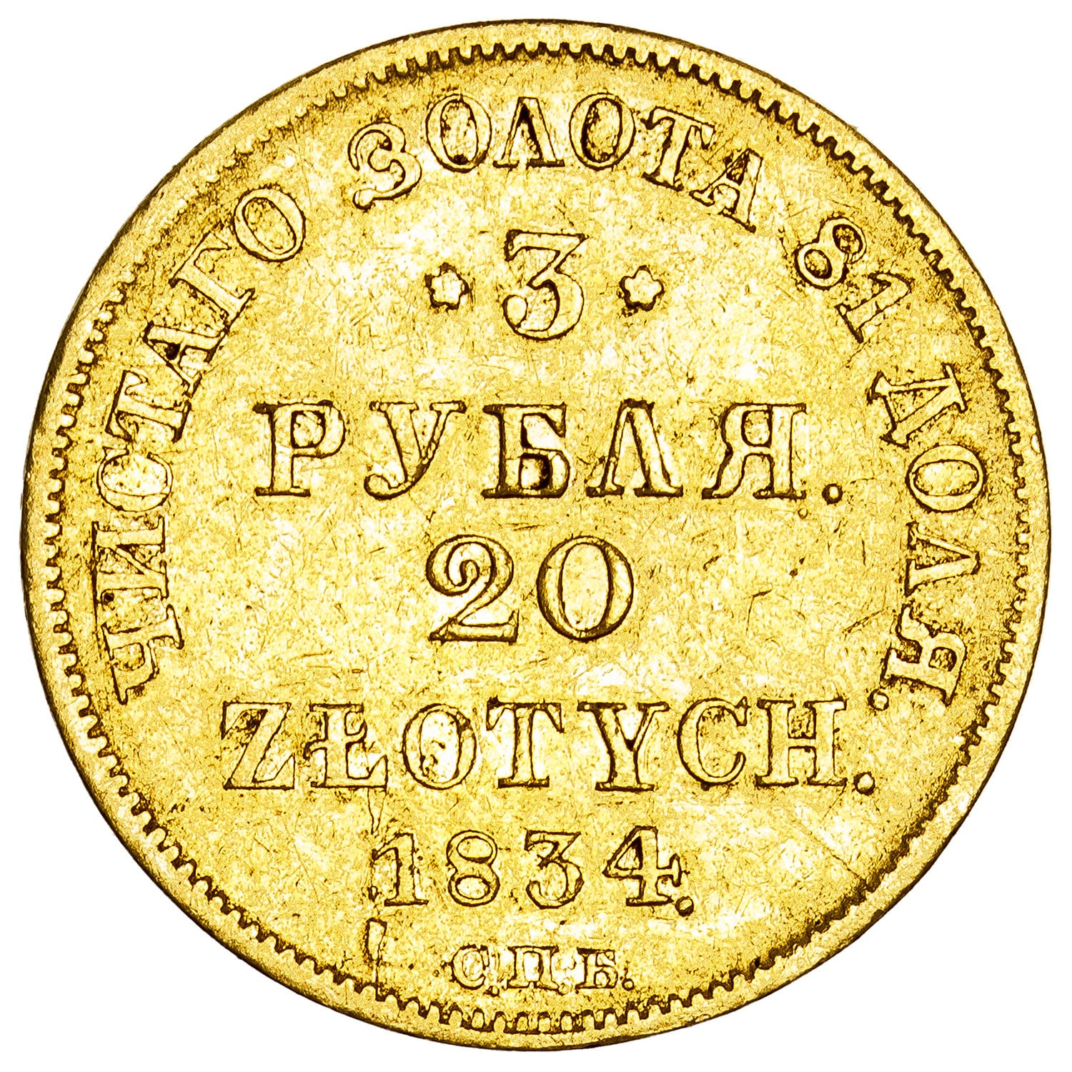 POLOGNE Nicolas Ier (1825-1855). 20 zloty - 3 Roubles 1834, Saint-Pétersbourg.
