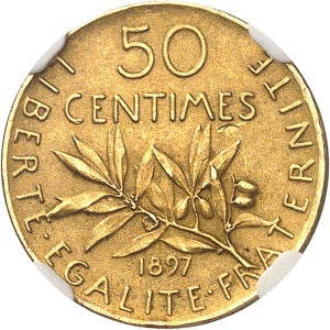 FRANCE IIIe République (1870-1940). Piéfort de 50 centimes Semeuse en Or, flan bruni et mat (PROOF MATTE) 1897…