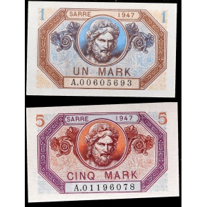 SARRE - SAAR Lot (2) - 1 mark et 5 mark type “Allemagne/Sarre” 1947.