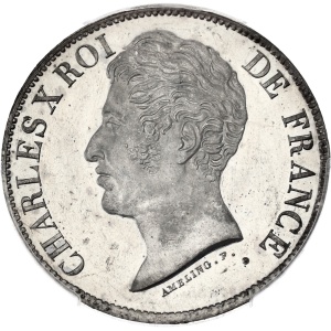 FRANCE Charles X (1824-1830). Essai uniface d’avers de 5 francs, concours de Ameling ND (1824-25).…