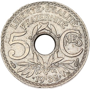 FRANCE IIIe République (1870-1940). 5 centimes Lindauer, variété à l’étoile 1938, Paris.…