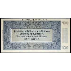 BOHÊME-MORAVIE - BOHEMIA AND MORAVIA 100 korun (SPÉCIMEN) 20 août 1940.